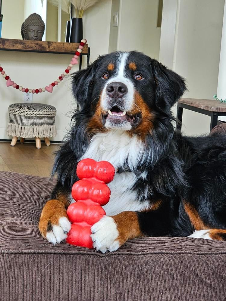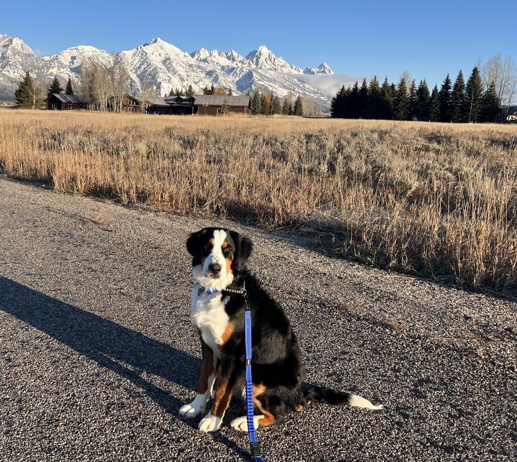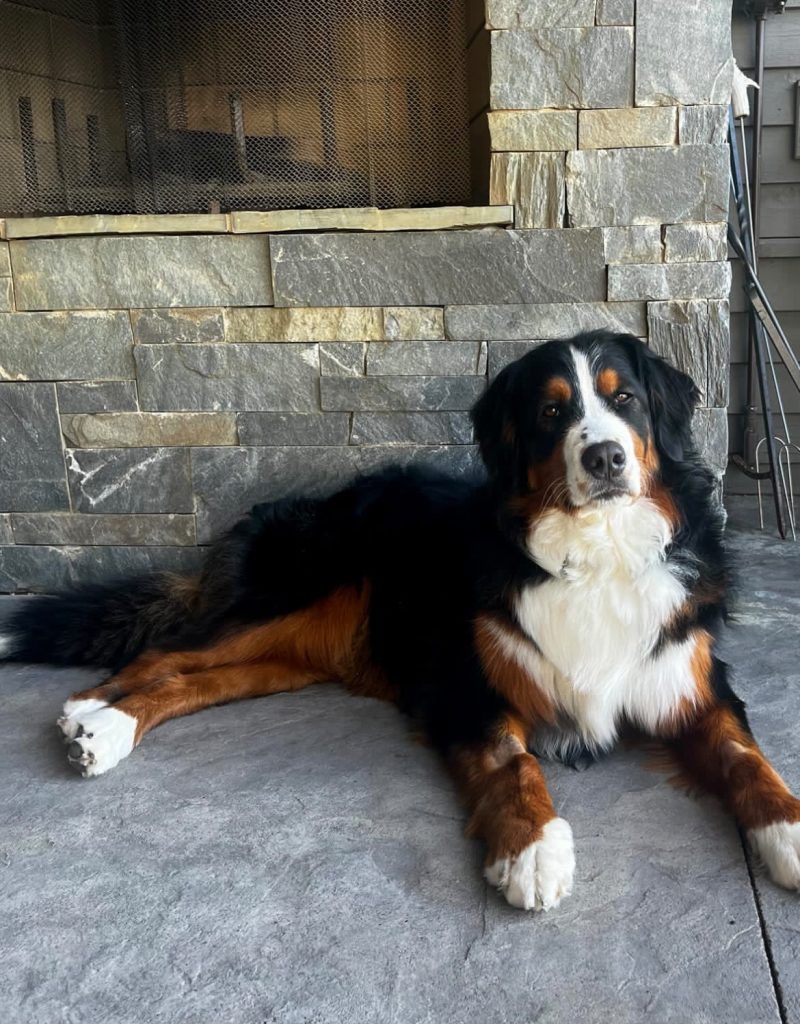 ‘This is Lizzy. She’s a five year old Berner from the litter of Raja and Tiberius. She is the goofiest sweetest girl. She’s sassy but she’s so gentle with baby nieces. Just such an easy sweet dog. Her joys in life are chasing squirrels (not very effectively) and playing with the other big dogs at doggy daycare, where she is an absolute queen! I am personally grateful for Montana Berners everyday for helping bring such an amazing pup into my life!” – Kate D.